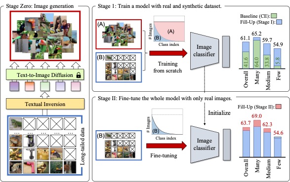 We propose a two-stage method for long-tailed (LT) recognition using textual-inverted tokens to synthesize images, achieving SOTA results on standard benchmarks when trained from scratch.